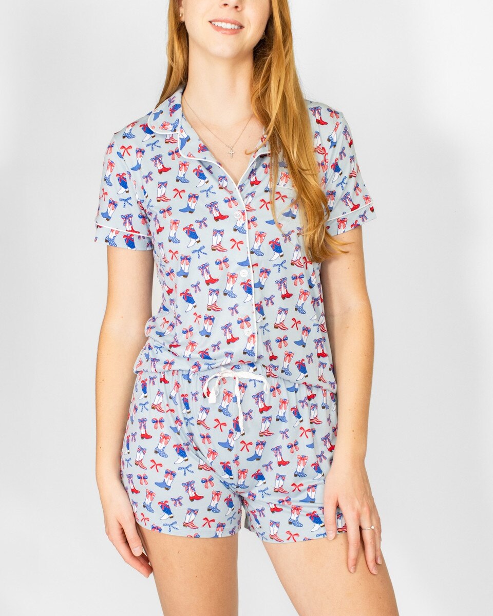 Slip into pure comfort with our Boots n' Bows Short Sleeve Button Up Sleep Shirt, where patriotic style meets cozy relaxation. Featuring a charming red, white, and blue design, this soft sleep shirt pairs perfectly with matching shorts or pants for your ideal pajama combo. The classic button-up front makes it easy to slip on and off, while the breathable fabric keeps you cool and comfortable all night long.