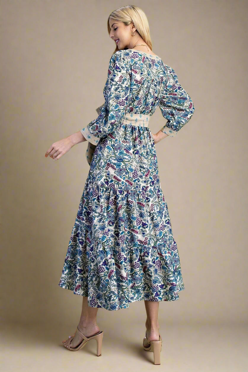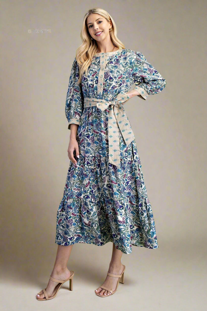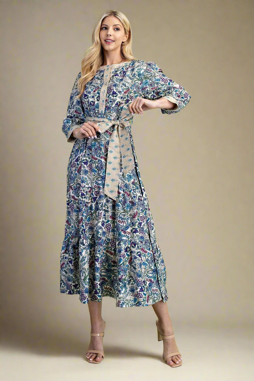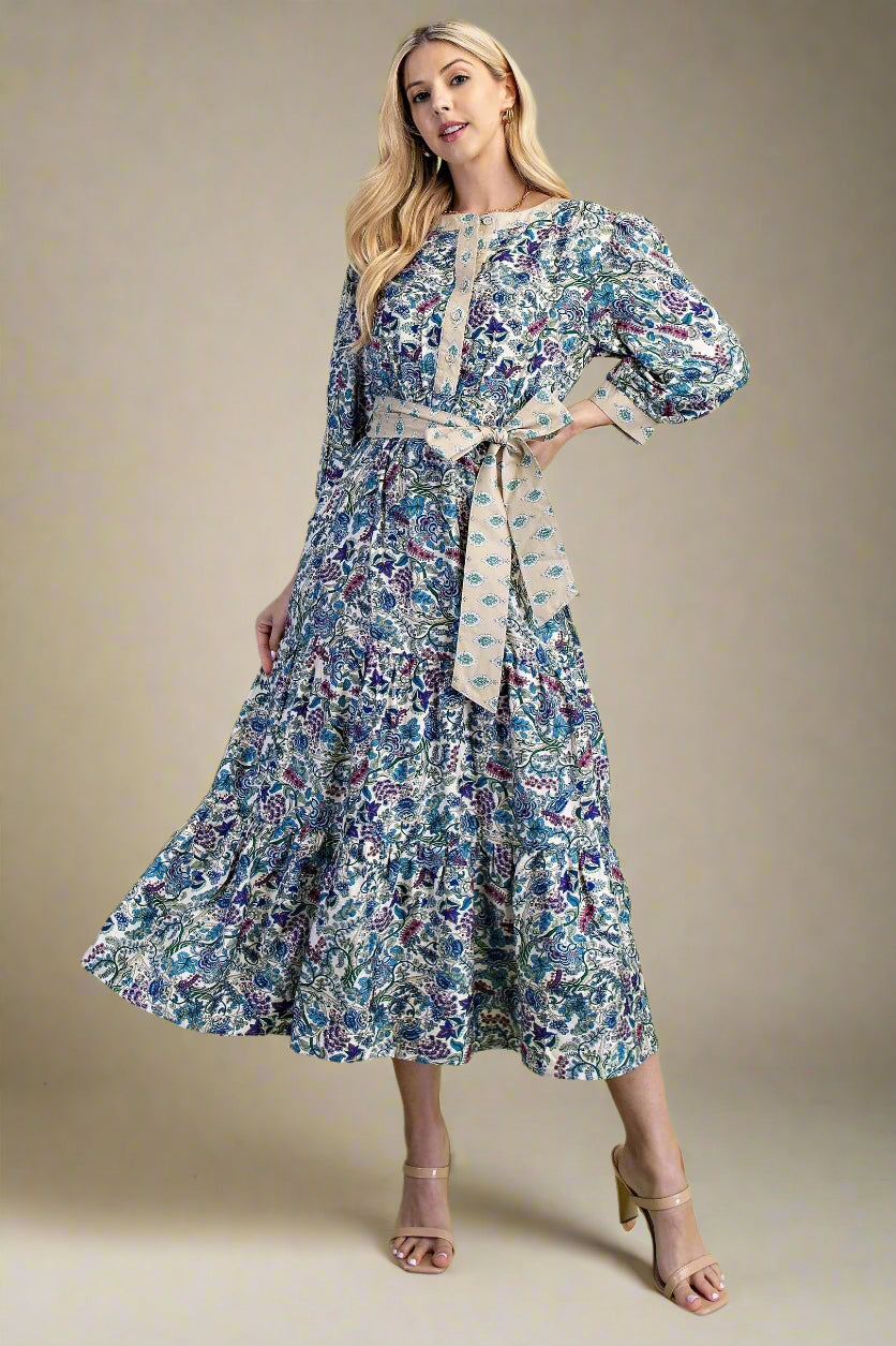 Step into charm with this Floral Paisley Midi Dress, featuring a playful mix of floral and paisley prints. The tiered design and half-button front add flirty flair, while contrasting fabric details bring a fun twist. With 3/4 sleeves and a midi length, it’s perfect for twirling through any occasion in style.
