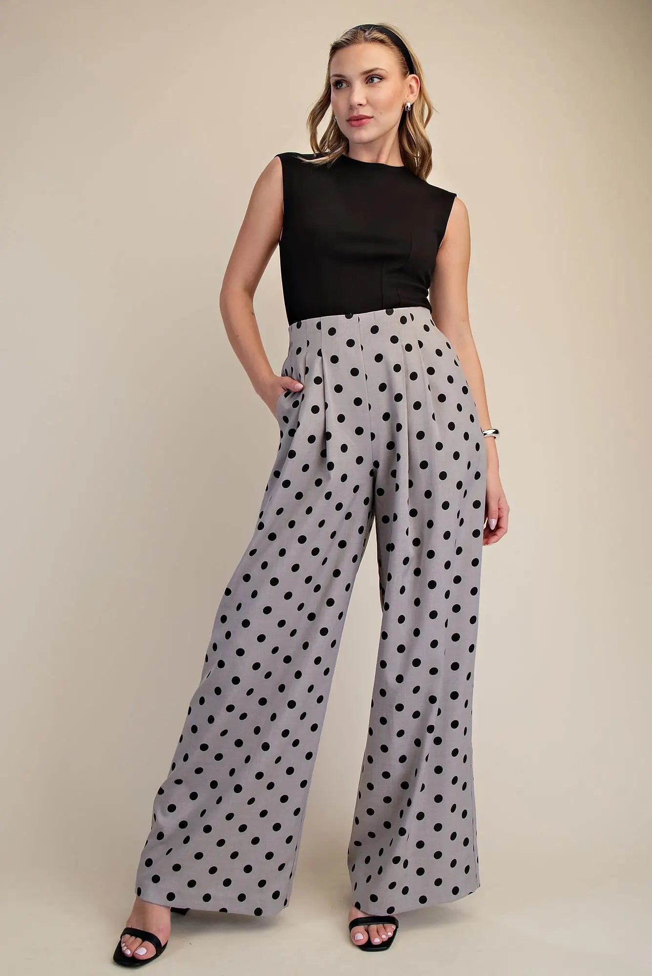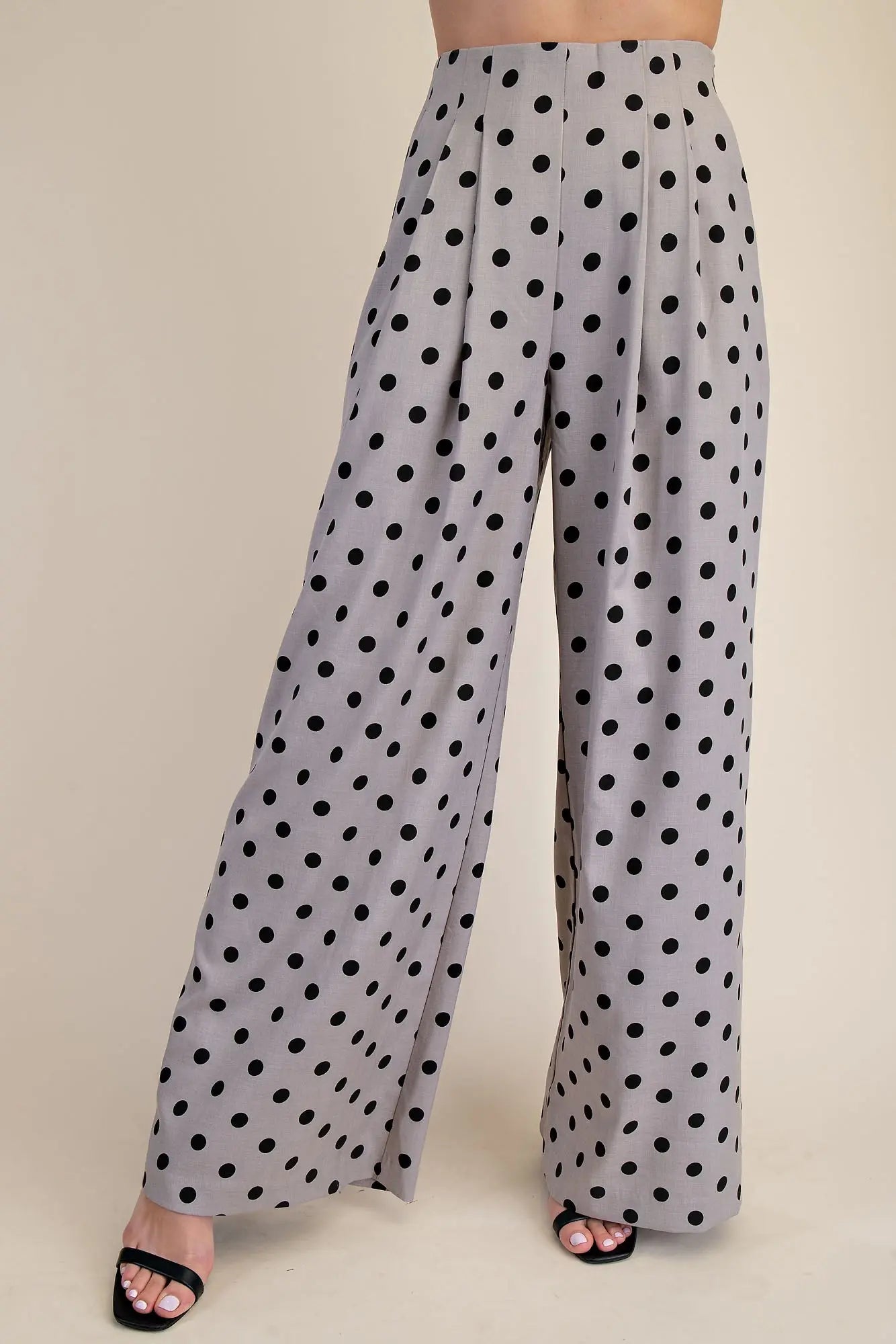 Make a statement with these playful polka dot high-waisted wide pants. The fun print pairs perfectly with the flattering pleated silhouette and comfortable elastic waistband, while the convenient side zipper keeps things practical. Whether you're dressing up or keeping it casual, these pants deliver style with an easy-going vibe that works for any occasion.