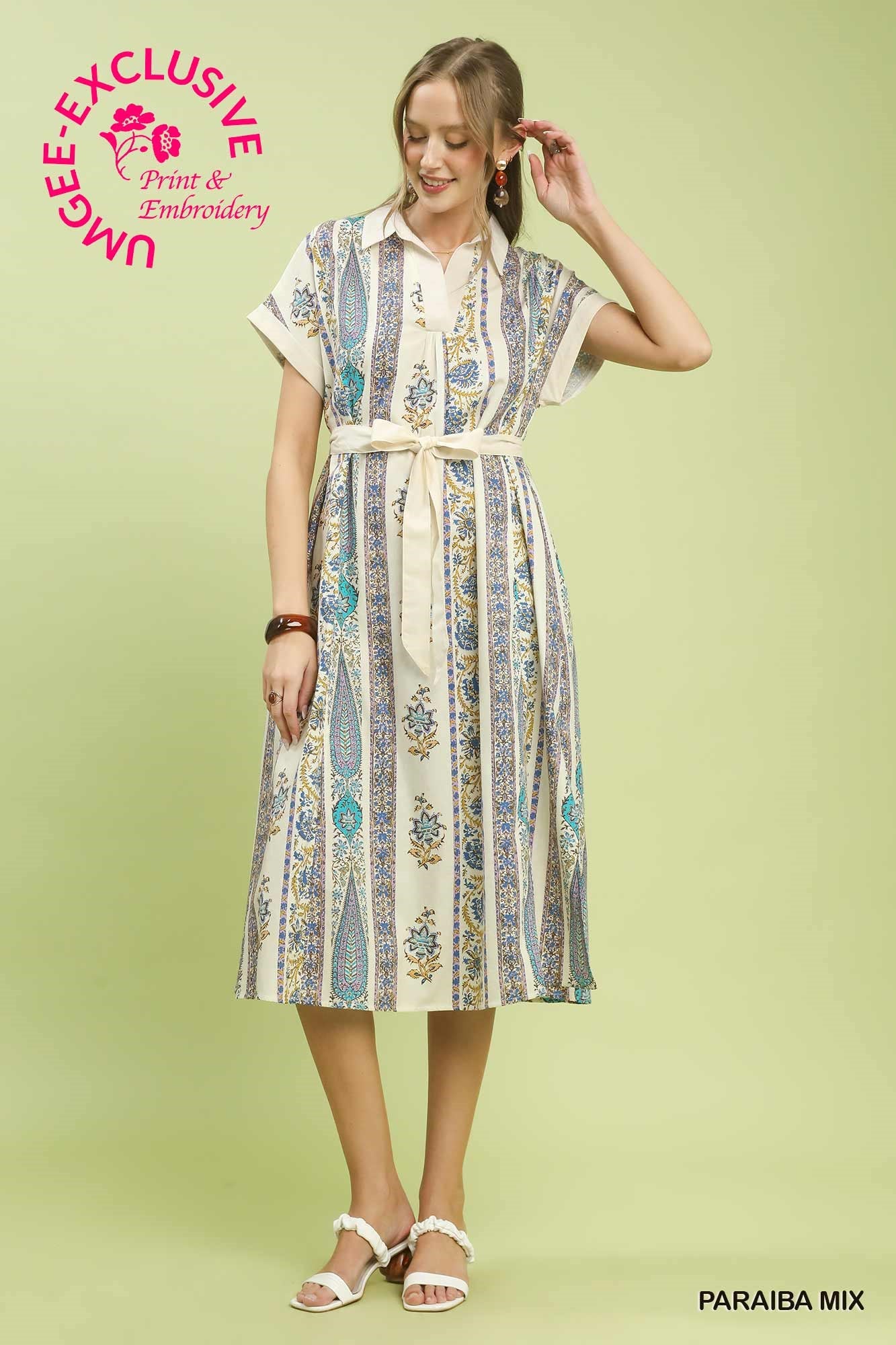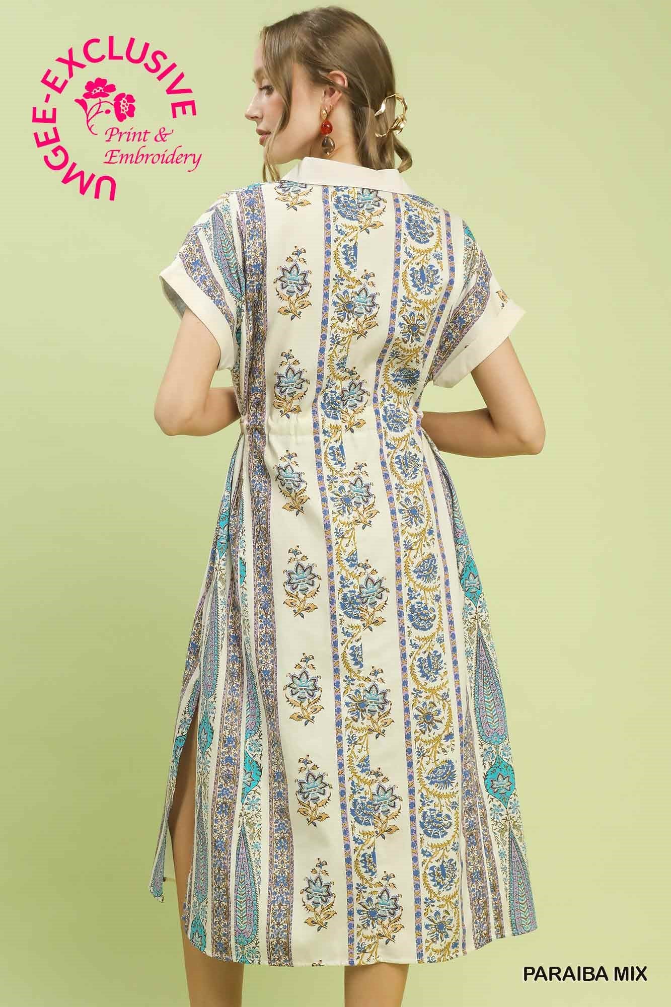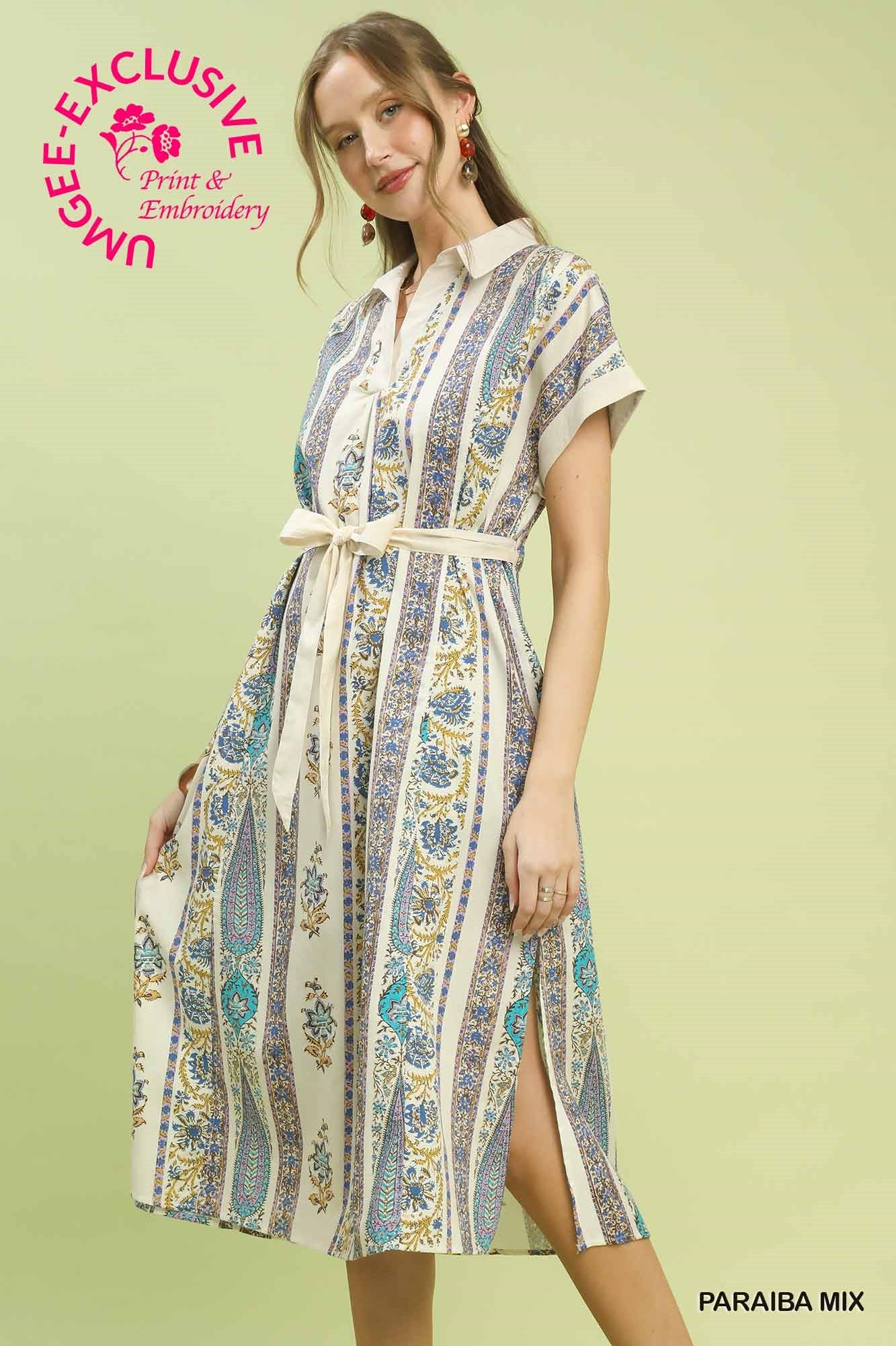 Embrace effortless bohemian style with this charming midi dress. The collared split V-neck and short cuffed sleeves create a relaxed, put-together look, while the adjustable self-tie waist lets you customize the fit to perfection. Practical side pockets keep your essentials close, and the unlined design ensures breathability for warm-weather wear.