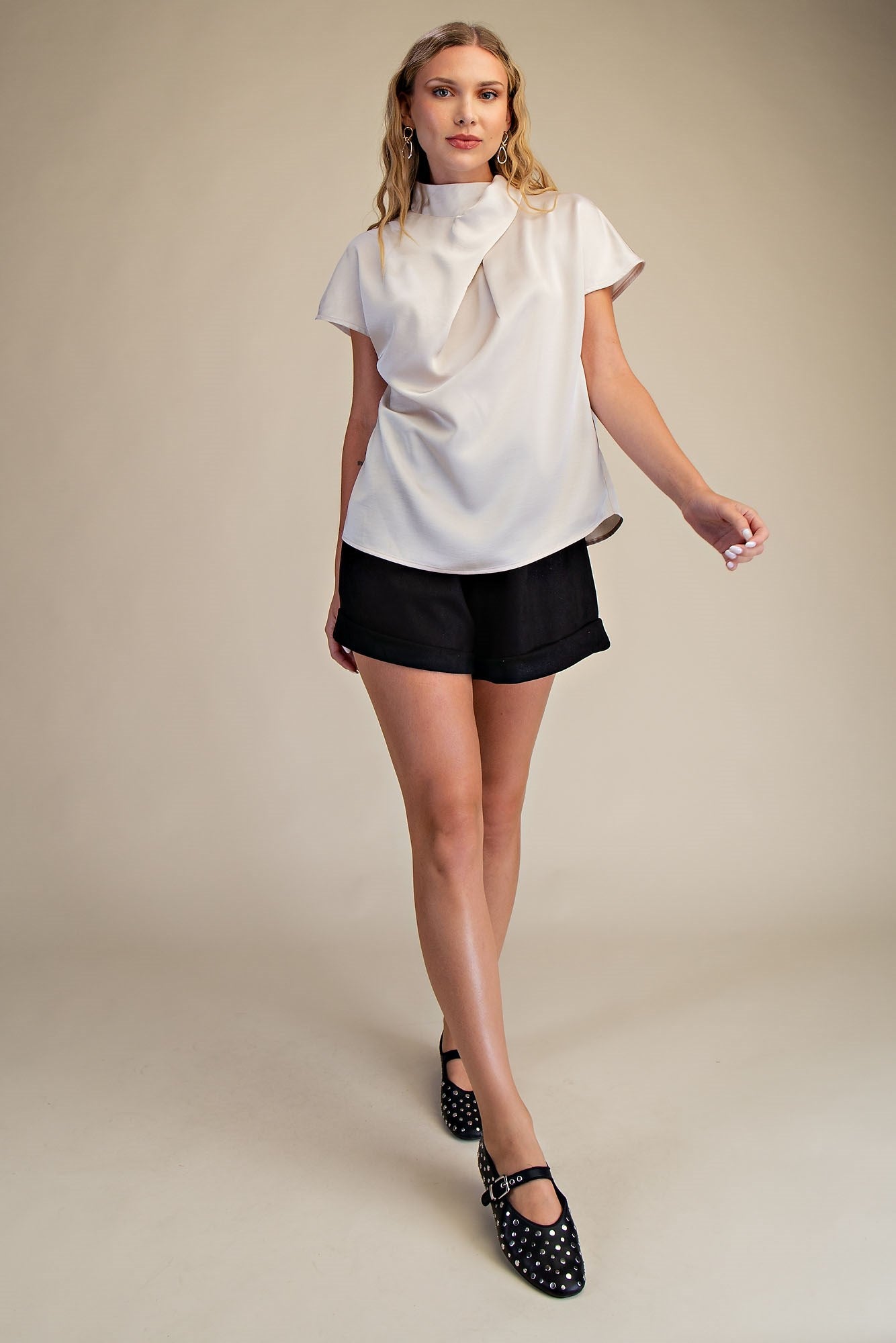 Elevate your style with the Cross Mock Neck Top, featuring a chic button back closure for a flirty surprise. Made from 100% polyester, this top combines comfort and effortless elegance, perfect for those days when you want to play it cool with a touch of sophistication.
