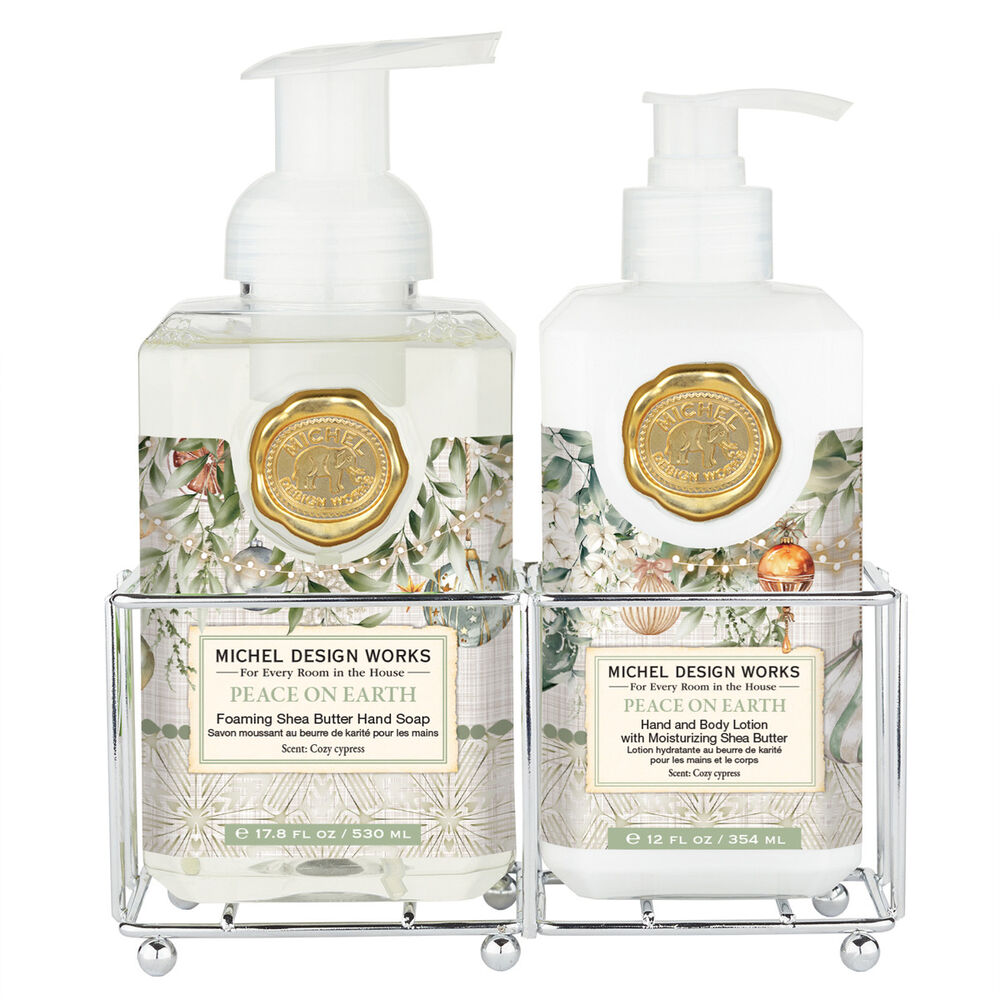 This set includes one foaming soap dispenser, one hand and body lotion, and a silver-toned caddy ... making it a perfect host/hostess gift for any holiday event.