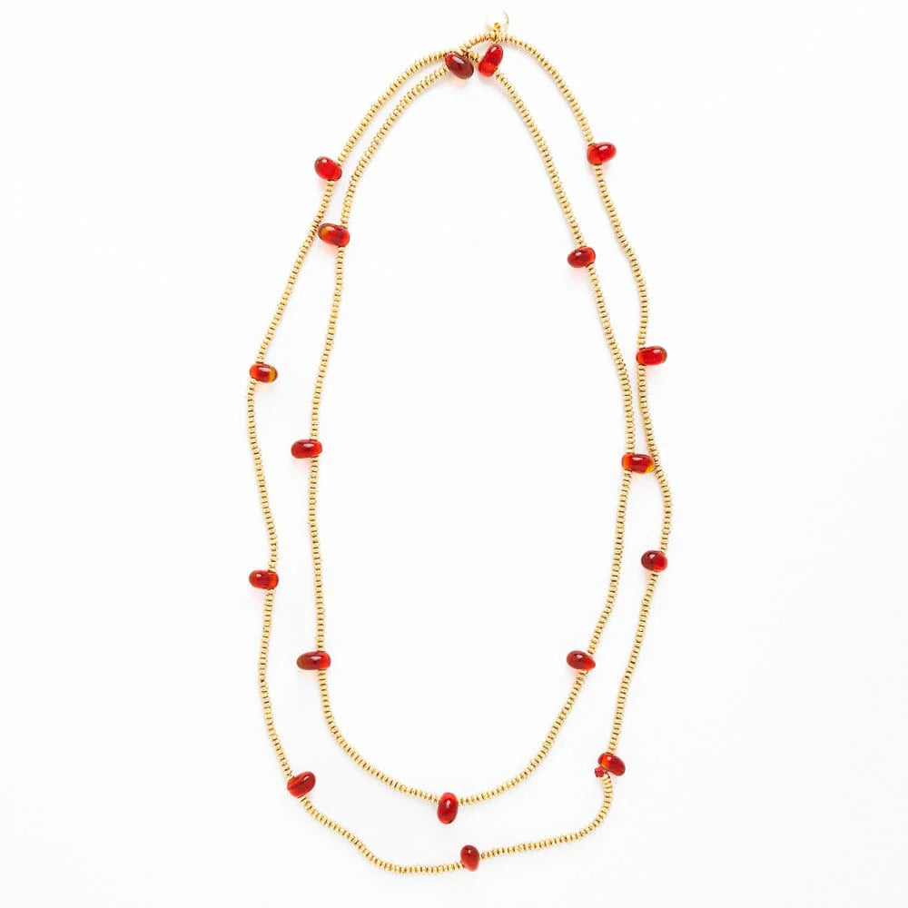 Add a splash of fun to your look with the Portia Gold Necklace. Featuring shiny brass beads and vibrant glass drops, this necklace brings just the right pop of color. Its length lets you wear it doubled for a layered vibe or loose for a breezy, playful style.