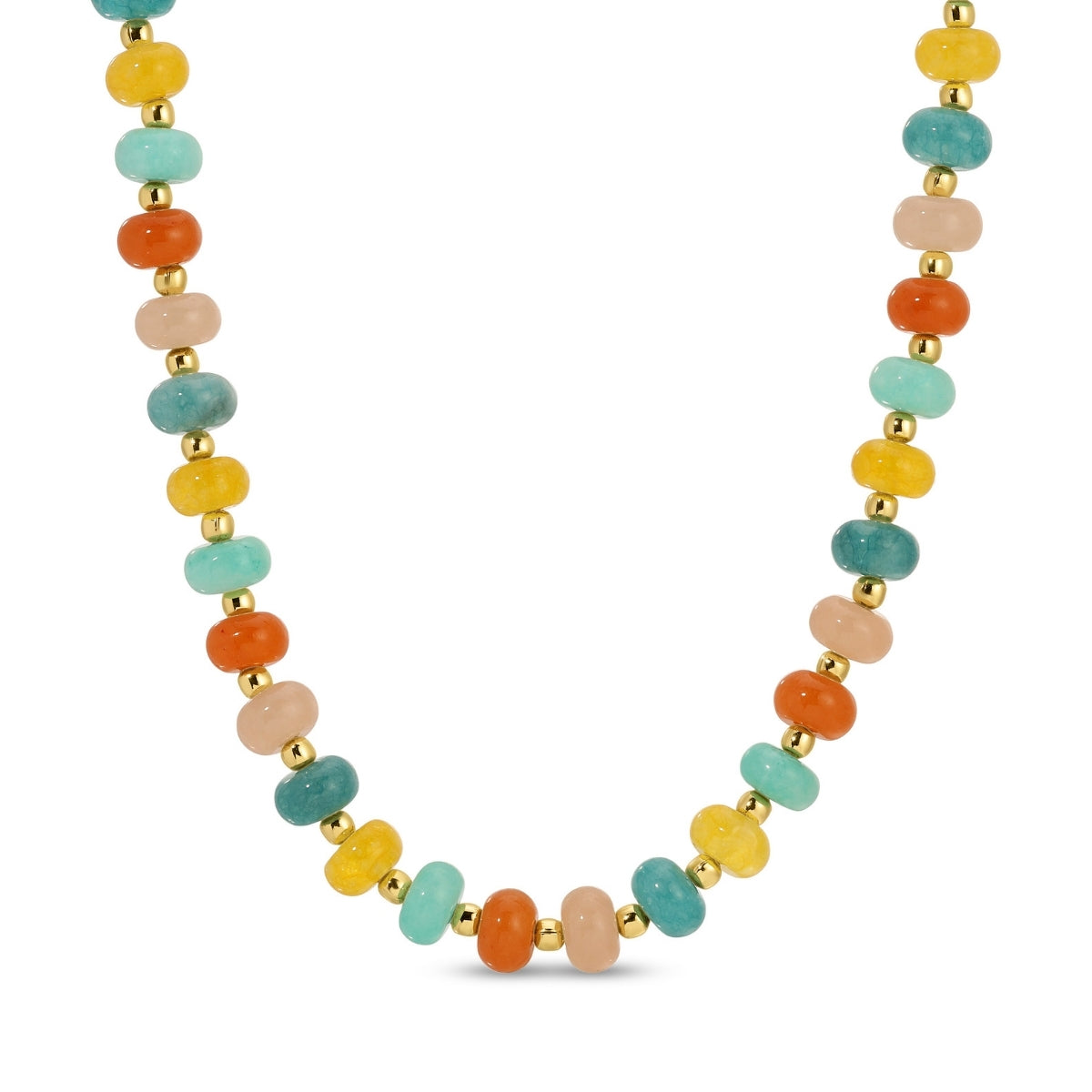 Make a bold statement with this eye-catching stretch necklace featuring vibrant multi-colored stones in aqua, peach, and yellow tones accented with delicate beads. The warm gold finish adds an elegant touch to this playful piece that effortlessly transitions from casual to dressy. Perfect for adding a pop of color and personality to any outfit, this versatile necklace brings joy and confidence to your everyday style.