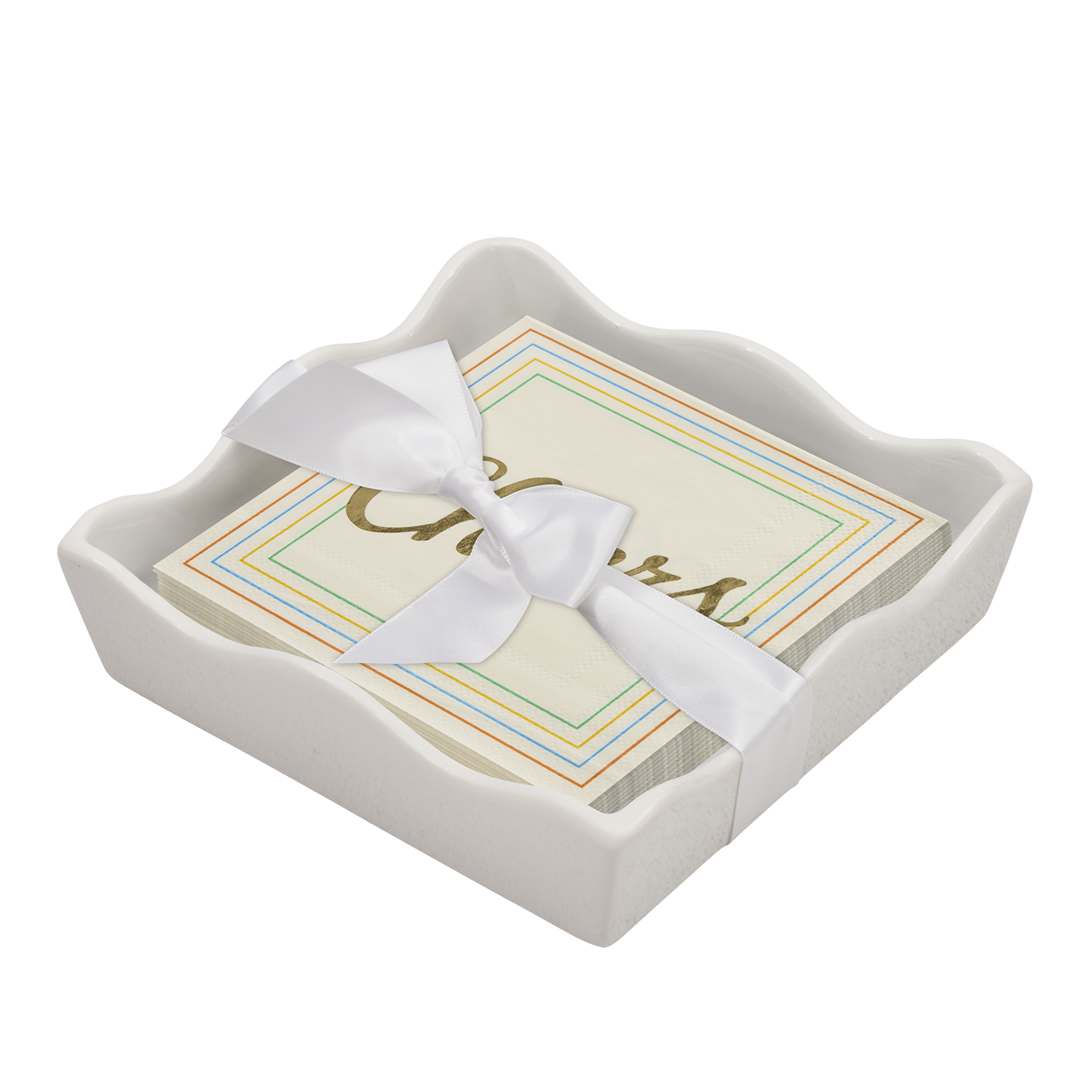 Elevate your entertaining with this charming ceramic napkin tray, perfect for hosting gatherings and cocktail parties. The elegant wave design adds a touch of sophistication to any table setting, while the included cheers-themed cocktail napkins bring festive flair. Ideal for keeping napkins organized and accessible during dinner parties, happy hours, or casual get-togethers. A thoughtful gift for hosts and entertaining enthusiasts alike.