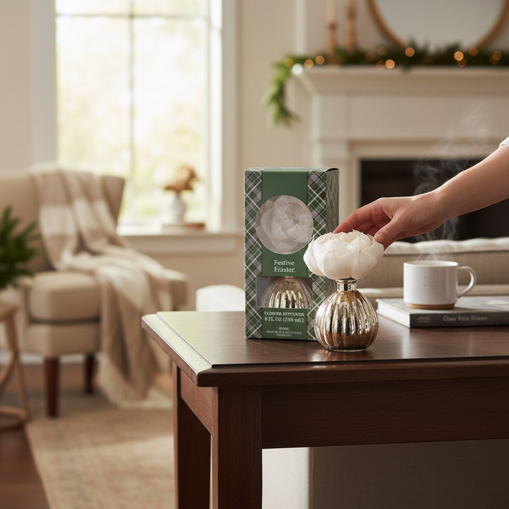 Transform your home into a holiday haven with our Festive Frasier Holiday Flower Diffuser! This stunning piece combines shimmering gold and silver mercury finishes for that extra dash of glamour your seasonal décor deserves. Watch as the neutral-toned flower blooms with fragrance, filling your space with warmth and festive cheer for over 60 days.
