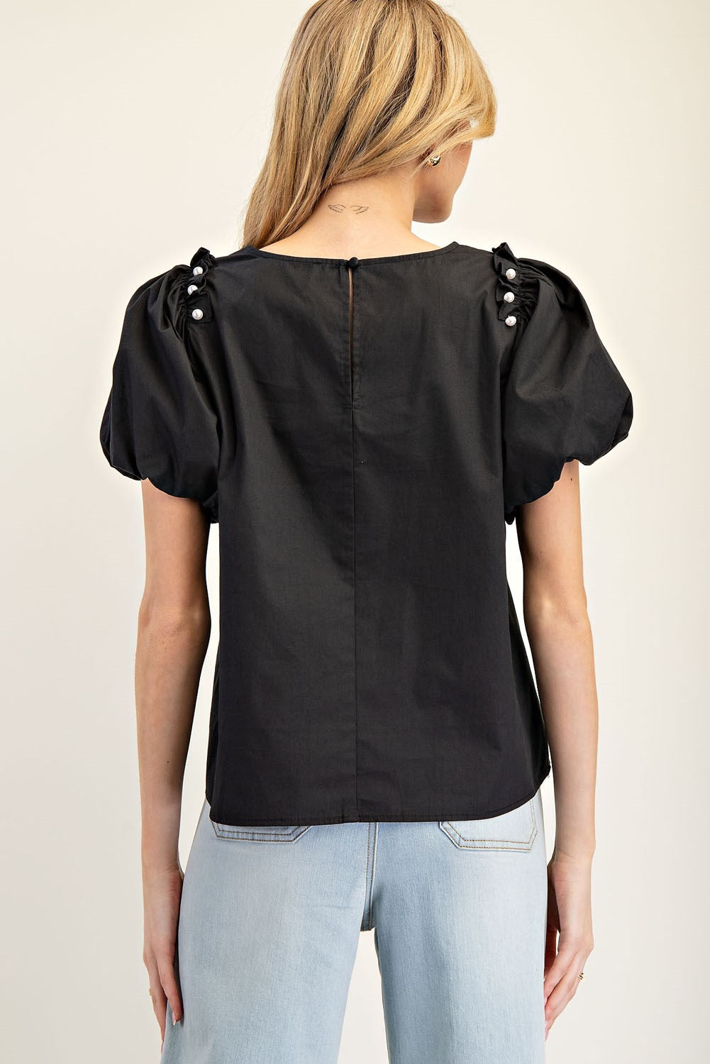Elevate your style with this Pearl Detailed Puff Sleeve Top, where playful puffed sleeves meet delicate pearl accents for a touch of charm. The classic round neckline and flattering relaxed fit make it easy to wear all day, while the button and loop closure at the back adds a sweet finishing detail.