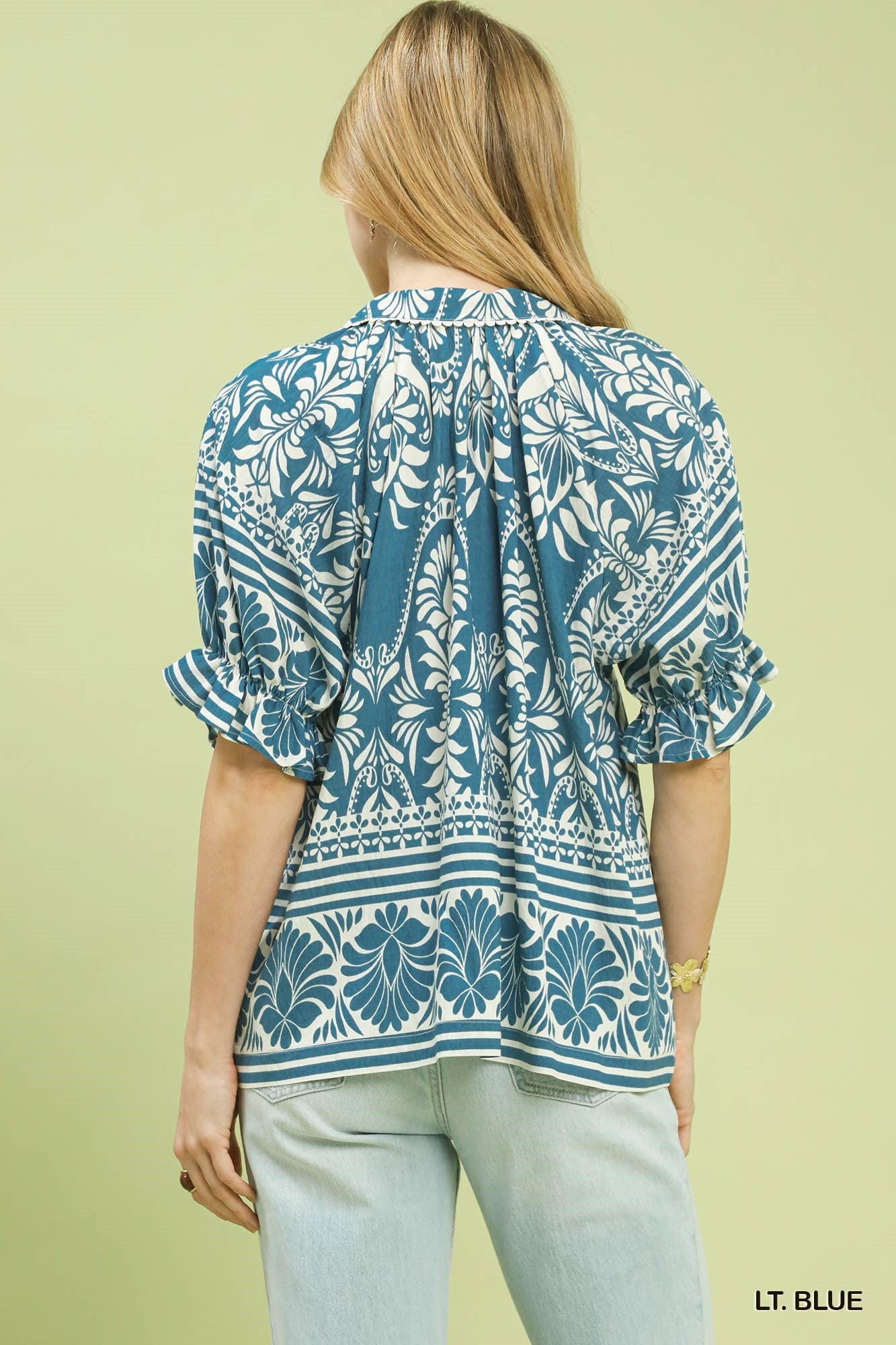 This eye-catching two-tone border print top is ready to become your new favorite piece. The striking print pops against the bold color contrast, while the V-neckline keeps things flattering and fresh. Delicate lace trim details add a hint of romance, and short puff sleeves with elastic bands create a playful silhouette that's both comfortable and on-trend. Wear it with confidence and watch the compliments roll in.
