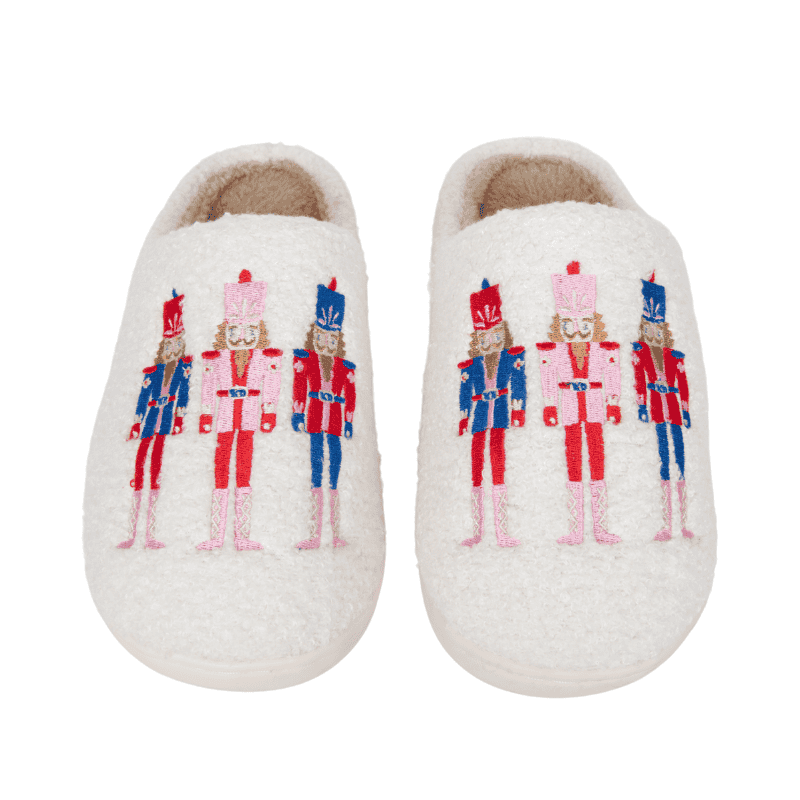 Step into holiday cheer with these Nutcrackers Holiday Sherpa Slippers. Featuring a ballet pink base and charming nutcracker embroidery, they offer cozy sherpa lining that feels like a warm hug.