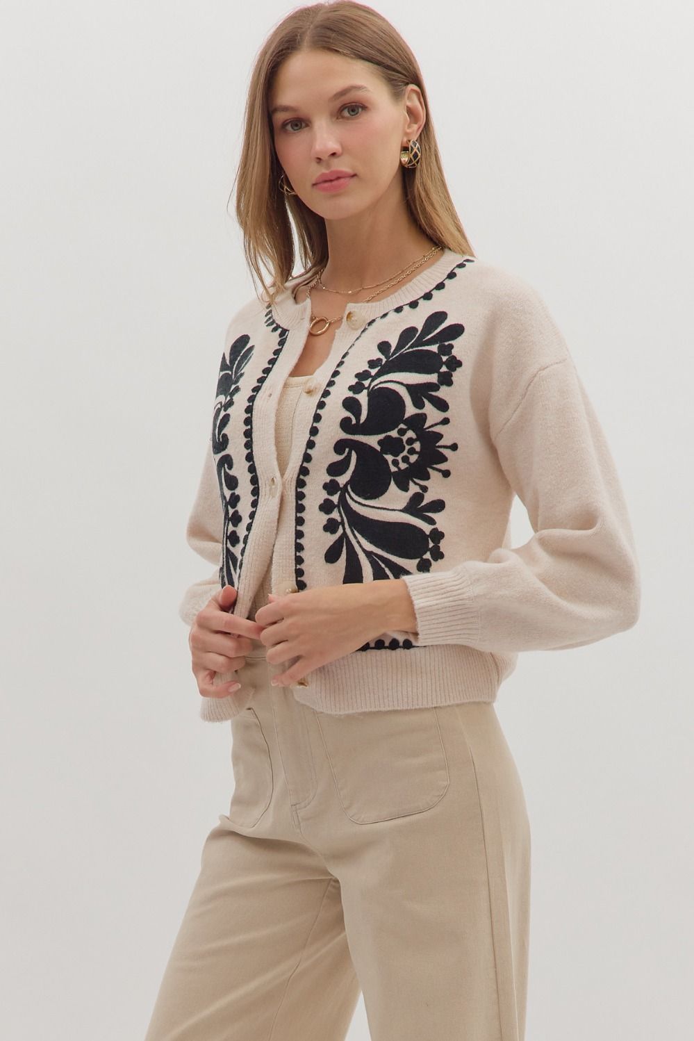 Wrap yourself in charm with this Floral Embroidered Knit Cardigan! With its playful floral embroidery and cozy medium-weight knit, it’s perfect for layering on those breezy days. The button-front closure and ribbed hem and cuffs add a snug fit, while the non-sheer fabric keeps things comfortably covered.