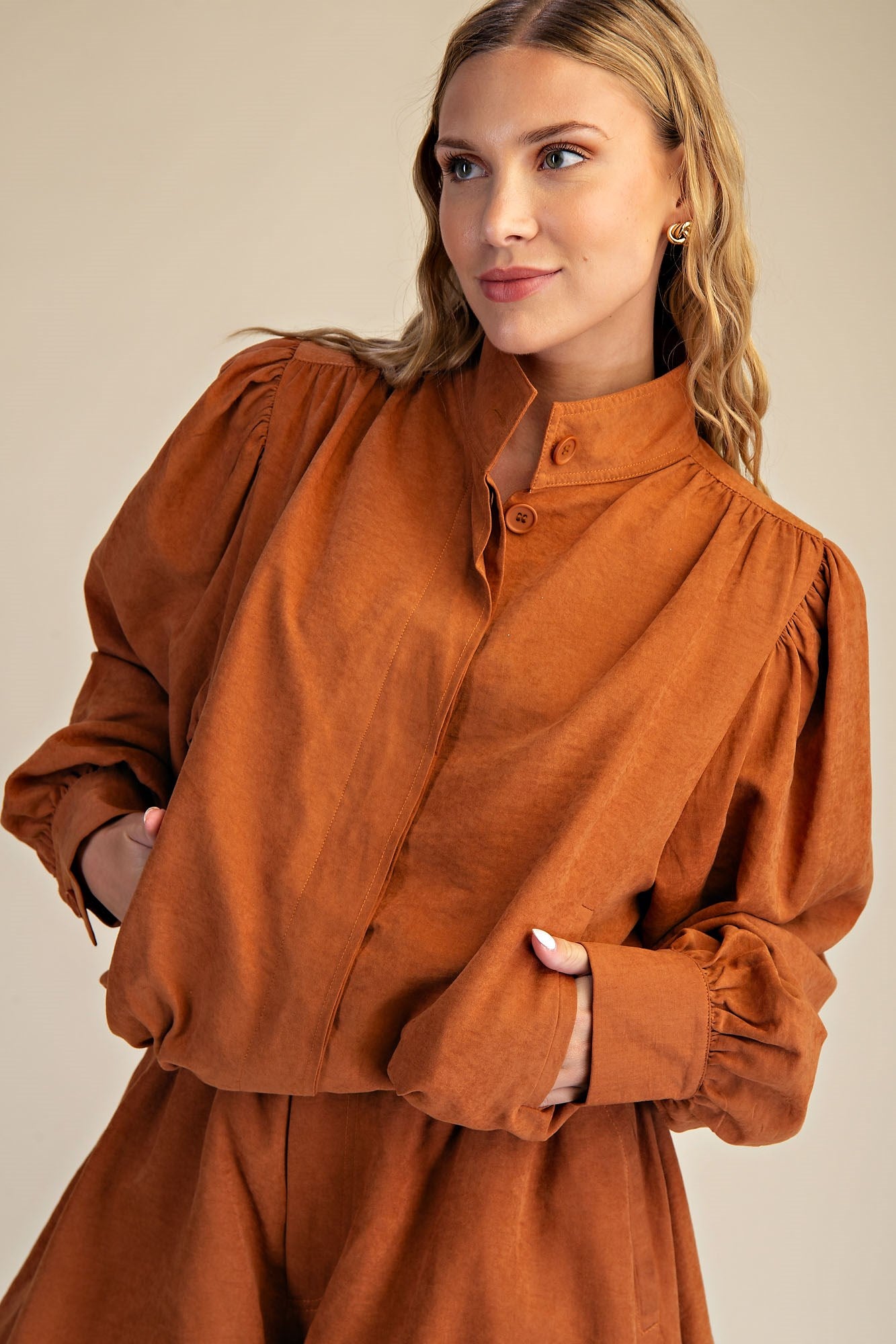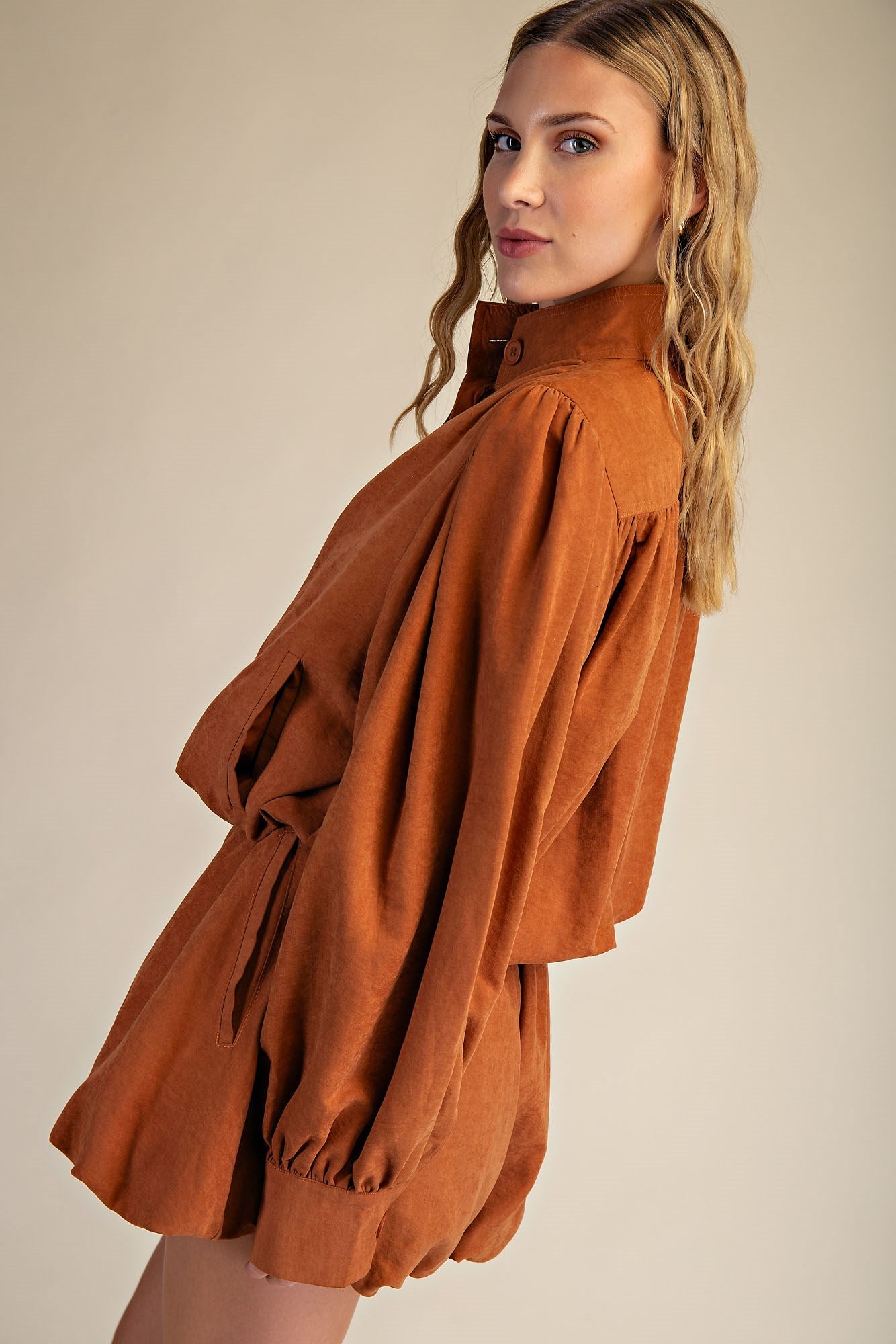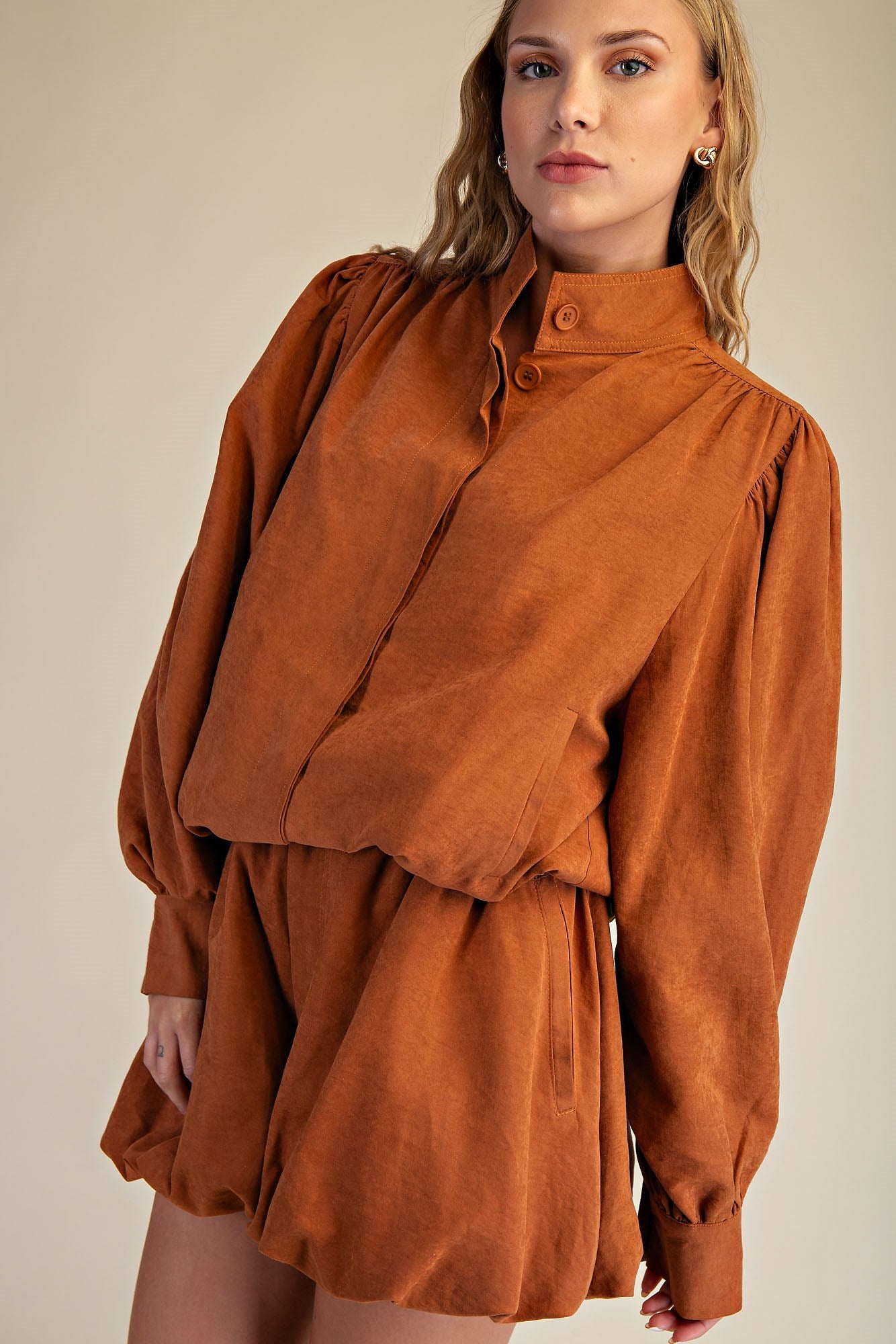 Elevate your style with this High Collar Balloon-Hem Jacket, designed to turn heads! Featuring a charming button-down front and playful pleating details throughout, this jacket adds a fun and flirty twist to any outfit. The high collar adds a dash of drama, while the balloon hem brings a whimsical, airy silhouette perfect for making a statement wherever you go.