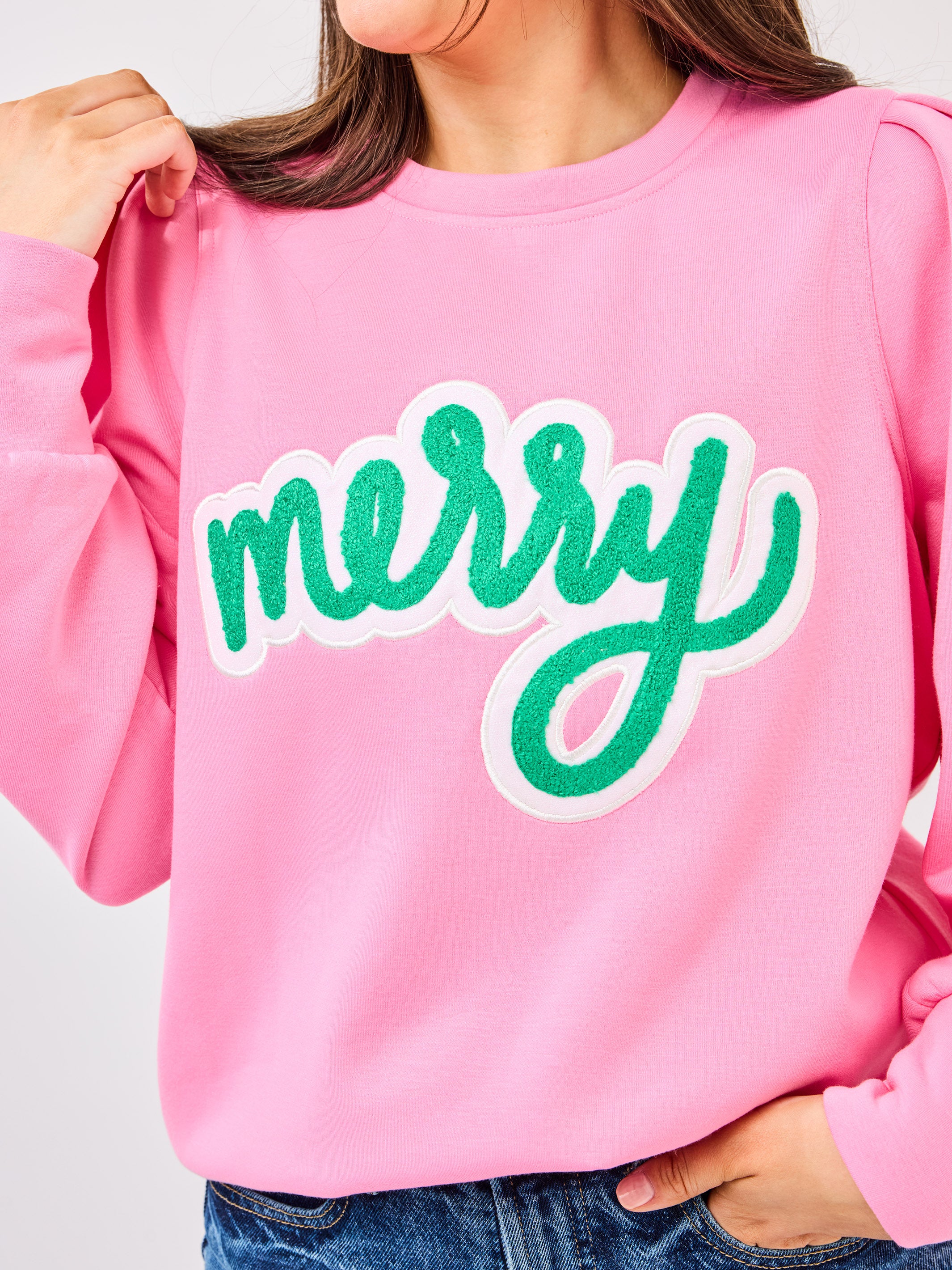 Celebrate the season in style with the Kelly Merry Sweatshirt. This playful pink sweatshirt features charming gathered sleeves that add a fun, festive flair. The bright "Merry" applique spreads holiday cheer, making it perfect for cozying up at parties or relaxing by the fire.