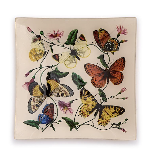 Transform any space into a whimsical wonderland with our Botanical Glass Trinket Tray. The elegant gold foil backing adds a touch of glamour, while the butterfly and botanical designs bring a playful charm. Perfect for displaying jewelry or keys, or simply as a decorative accent. Handmade with care for a sophisticated touch.
