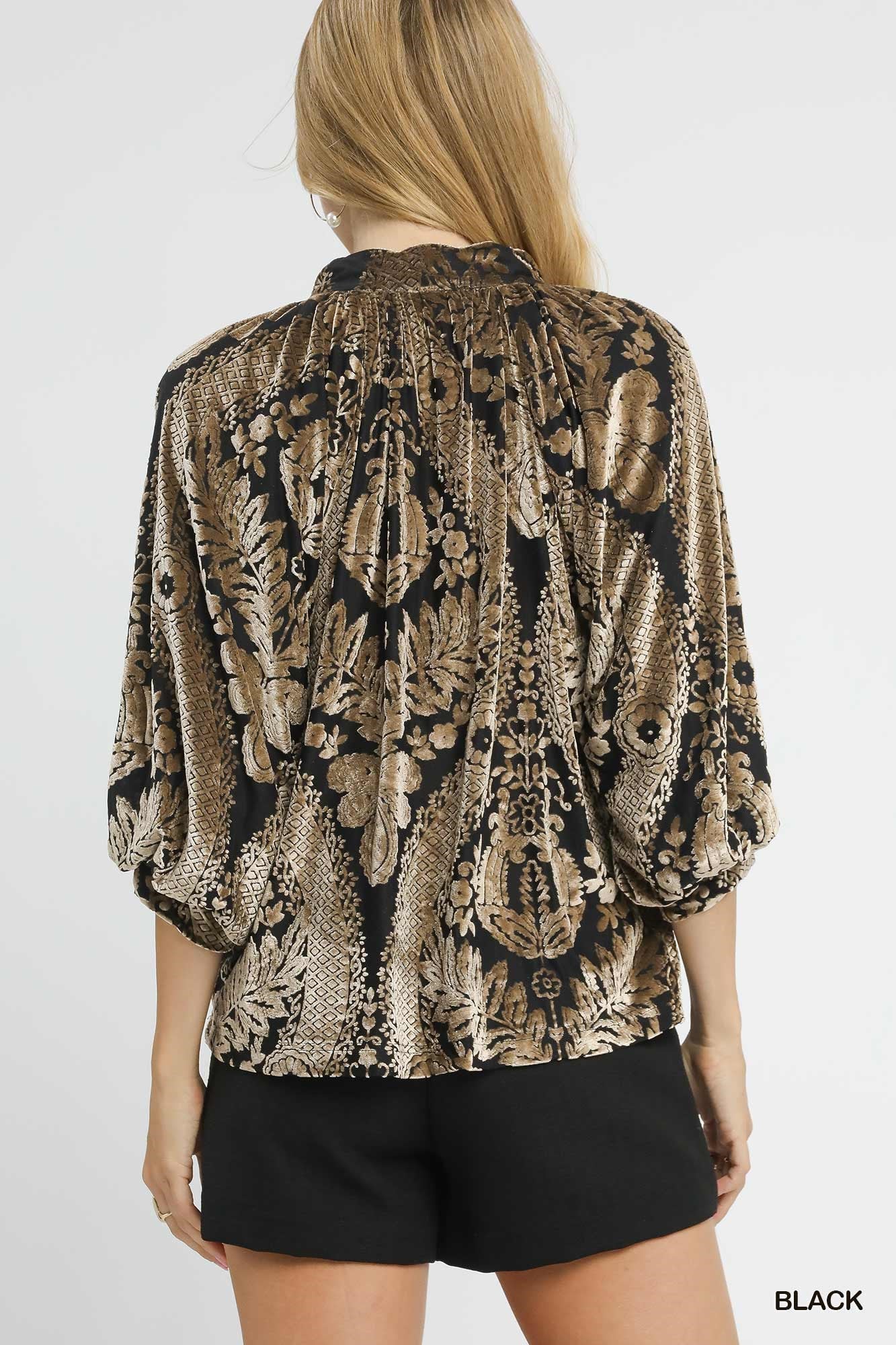 Elevate your look with this Damask Print Velvet Split Neck Top! Its textured velvet blend feels luxuriously soft, while the playful split V-neck adds a flirty touch. The raglan 3/4 length sleeves offer effortless movement, and the lining ensures comfortable wear all day long.