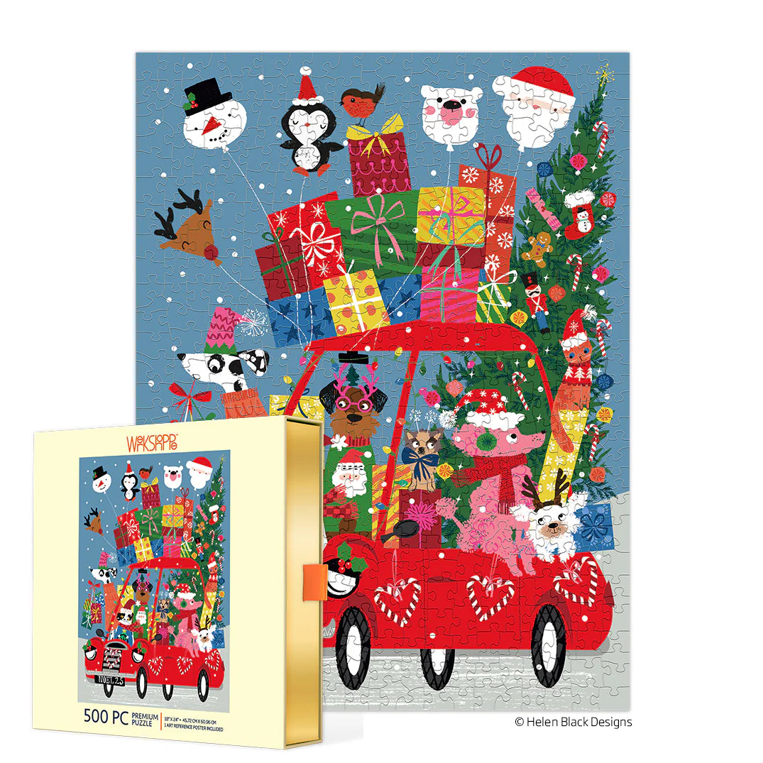 Get ready to cruise into holiday cheer with the Festive Fun Car Puzzle! This 500-piece adventure features a lively cartoon car loaded with playful cats and dogs and gifts piled high. Bright colors and whimsical details make it a cozy, cheerful activity—perfect for solo puzzling or sharing joyful moments with loved ones.