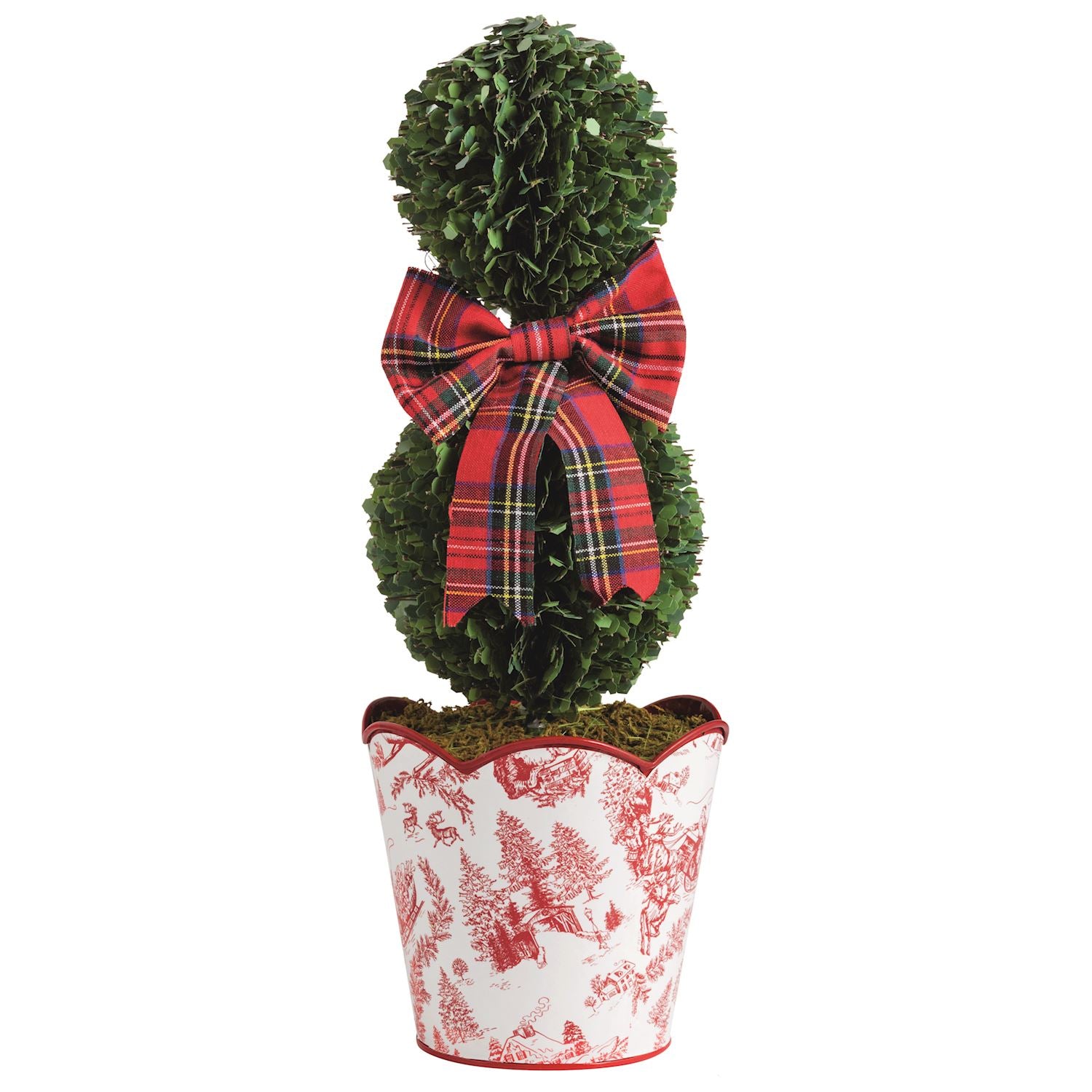 Add a touch of charm to any space with these Faux Boxwood Topiaries! Nestled in a delightful toile tin pot with a scalloped edge and topped with a playful tartan bow, they bring classic style and whimsy together.