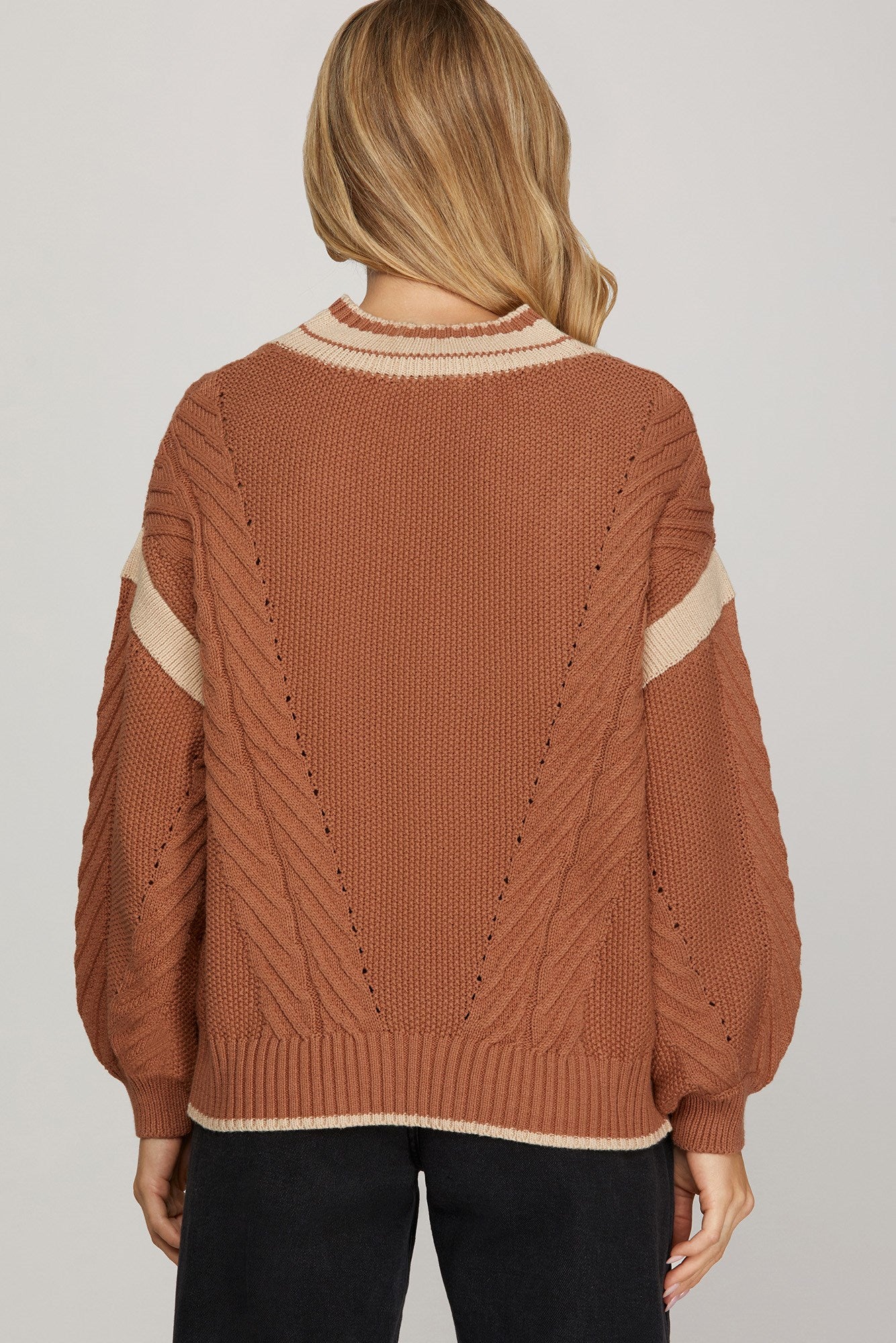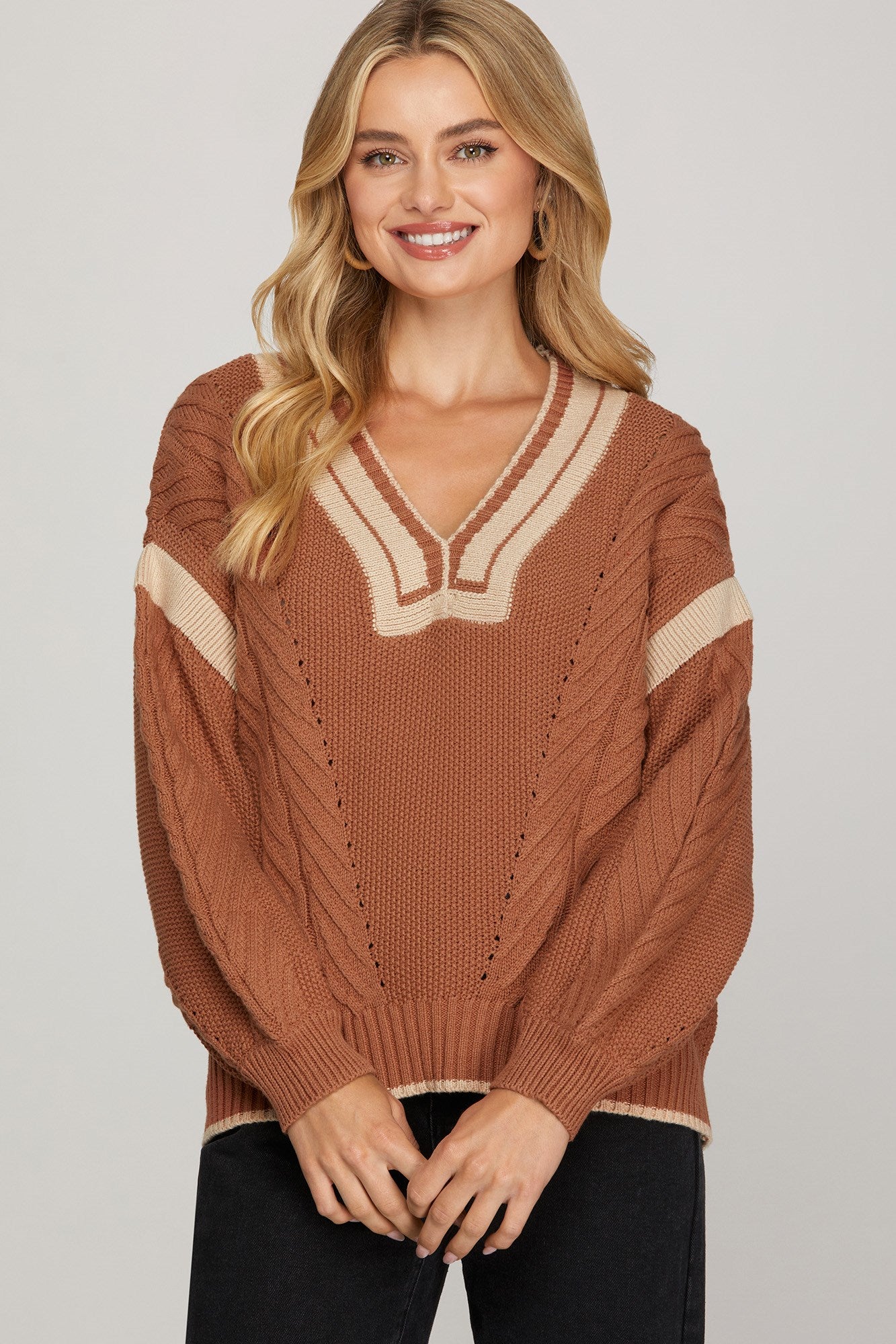 Wrap yourself in cozy charm with this V-Neck Cable Sweater, featuring a playful twist of contrast detailing. Perfect for crisp fall days, its rich colors bring warmth and style to your look. The classic cable knit adds texture, while the long sleeves keep you snug and ready for anything.