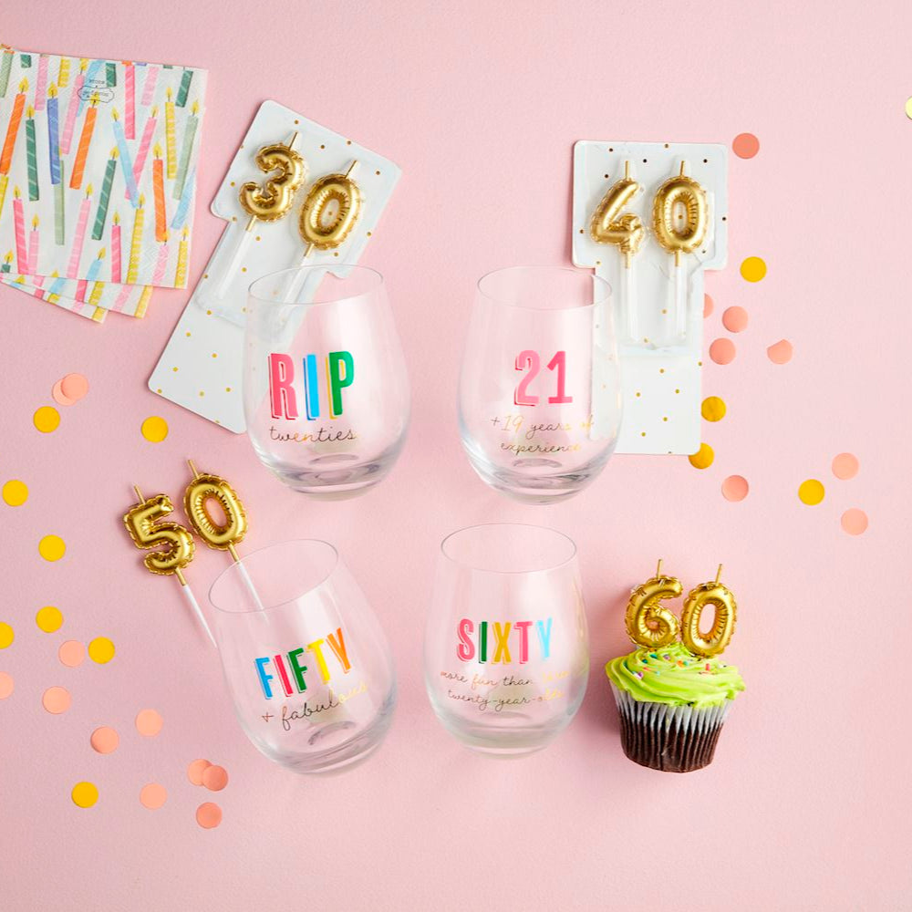 Celebrate in style with this playful 3-piece set featuring a stemless foiled wine glass and two birthday cake age candles. Perfect for toasting special moments, this set adds a fun and festive touch to any birthday celebration.